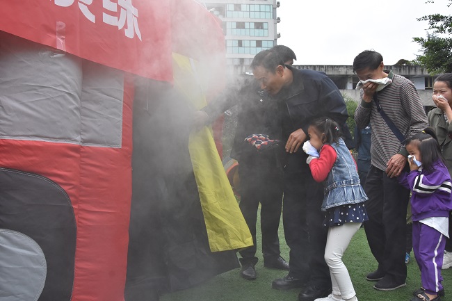 为了不断增强孩子的自我保护意识,锻炼逃生自救的能力,从小培训安全素养,在第28个“119消防宣传日”来临之际,温江区柳城幼儿园特邀四川省消防协会科普委专职教官罗辉到园,组织中班组幼儿开展了一次别开生面的亲子消防逃生帐篷演练。